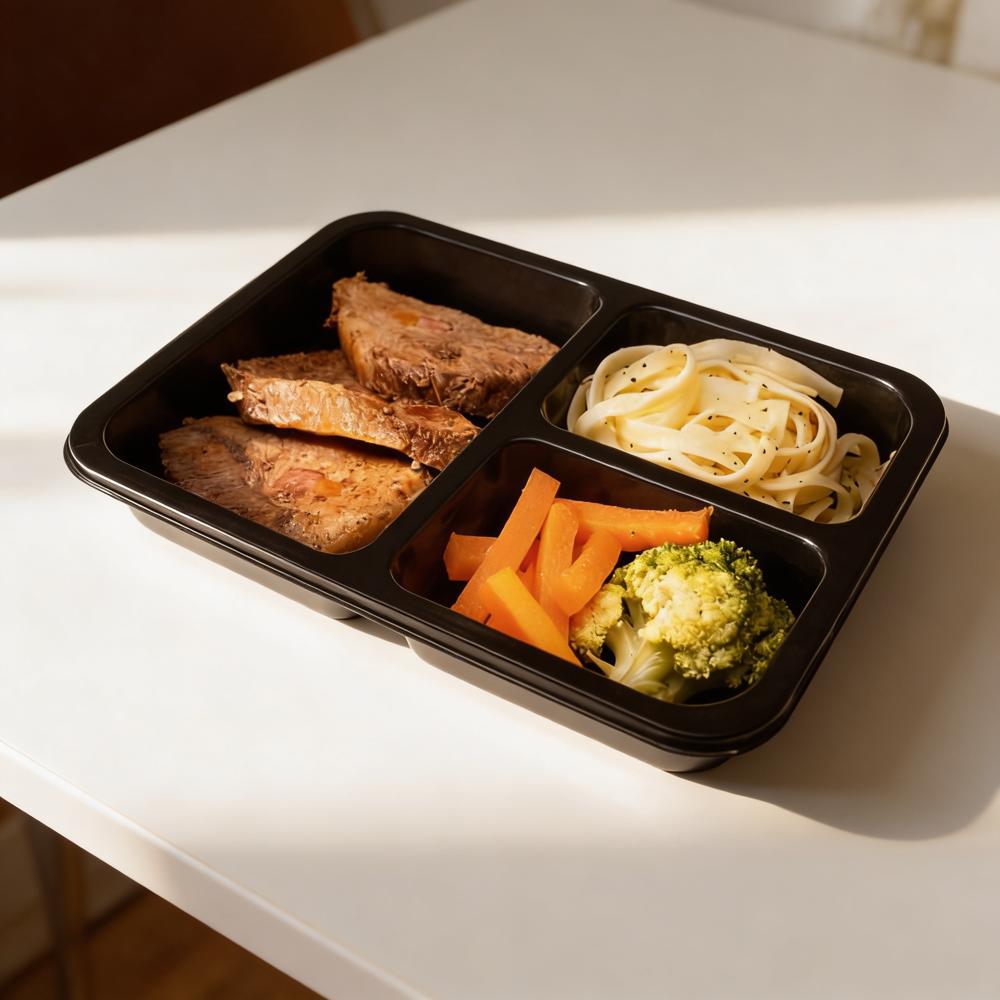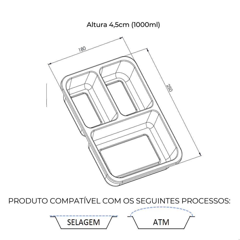 Bandeja para refeições prontas com divisórias, ideal para pratos completos, garantindo organização, segurança alimentar e excelente apresentação no ponto de venda.